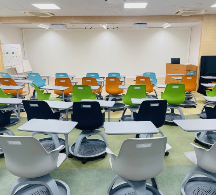 わくわくルームはメタバースを取り入れた特別なお部屋になります。メタバースは、インターネットの中に作られた空間で遠い場所にいる方とも話すことができます。いろいろな授業に使える、机やイスがおしゃれなお部屋になります。